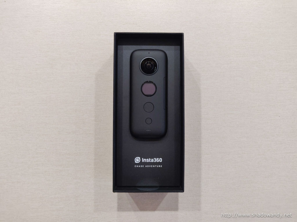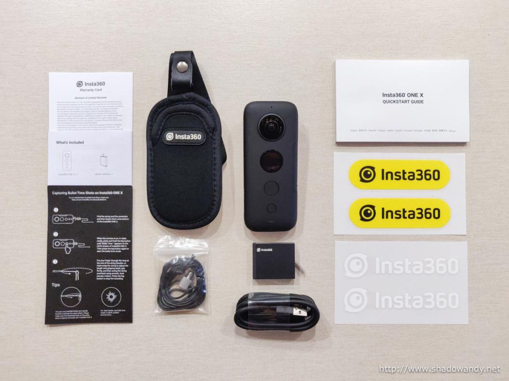 Beneath the Insta360 One X are the manuals, charging cable, battery and string attachment.