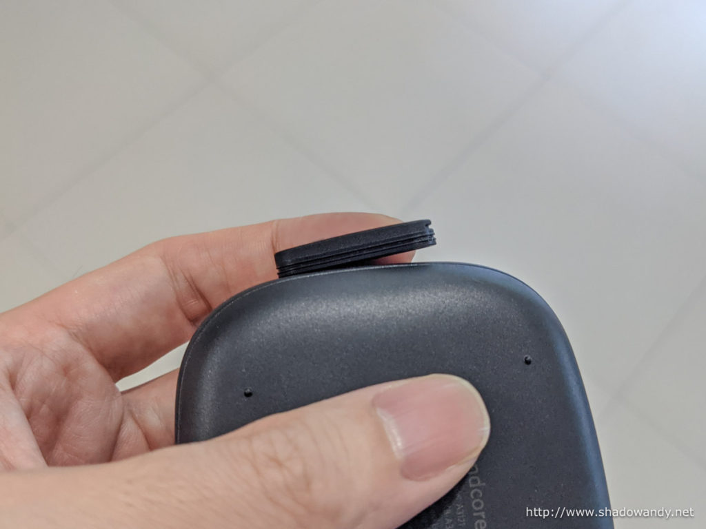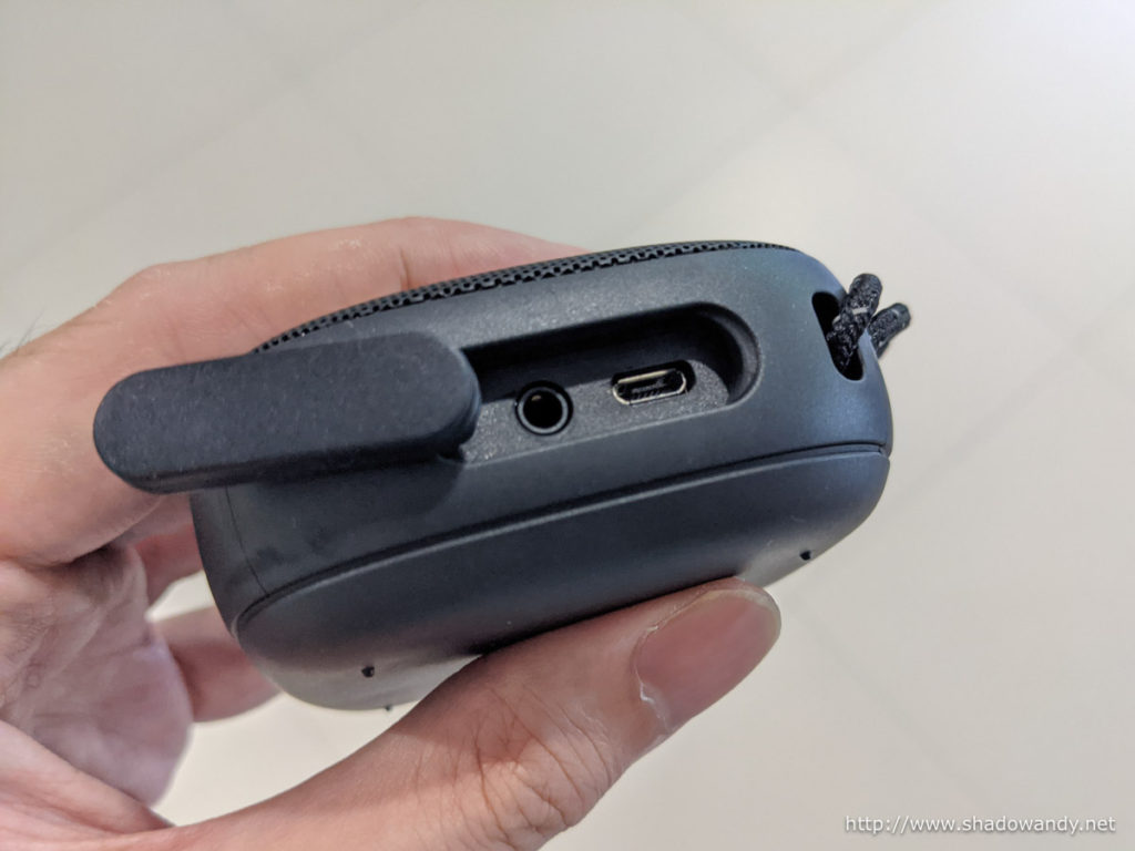The covered up ports at the side of the Anker SoundCore Icon Mini Bluetooth speaker.