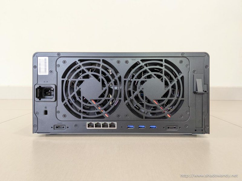 At the center of the DS1821+ NAS are two (2) 120mm system fans. To the left are the IEC-320-C14 power connector and Kensington lock slot. To the right of it is the PCIe slot for additional Synology accessories like 25GbE or 10GbE Network Interface Card.