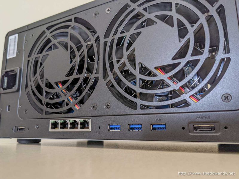 Near the bottom are the eSATA port, four (4) Gigabit LAN ports, reset button, three (3) USB 3.2 Gen 1 ports and eSATA port.