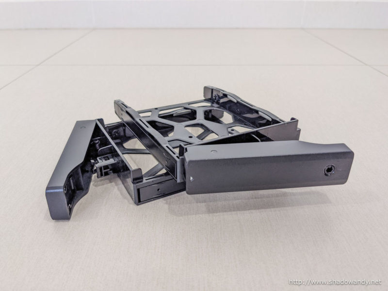 A light press near the bottom edge of the drive tray releases the handle and unlatches the drive tray from the NAS. The drive tray can be locked in place with the provided key.